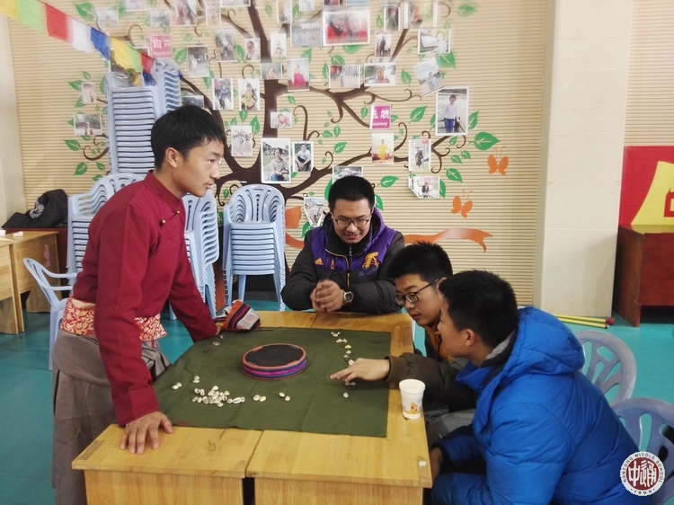 新增的“藏族骰子游戏展示”吸引了不少汉族男生参与其中。骰子游戏作为藏族传统的民间娱乐游戏之一,在藏族人民的日常生活当中扮演着不可忽视的角色,在藏区的每个角落都散发着独有的气息。一方桌上铺上骰垫,中间置一骰盘,放上骰碗一只和骰子一对,四周摆上古币、木棍式样的筹码,以及用来计数的海贝和豆粒,就这架势就让汉族的同学兴趣盎然。而游戏中的智慧竞技以及藏式独特的骰词更让几位男生在妙趣横生的娱乐之中感受到浓厚的藏文化底蕴和浓郁的民族特色。