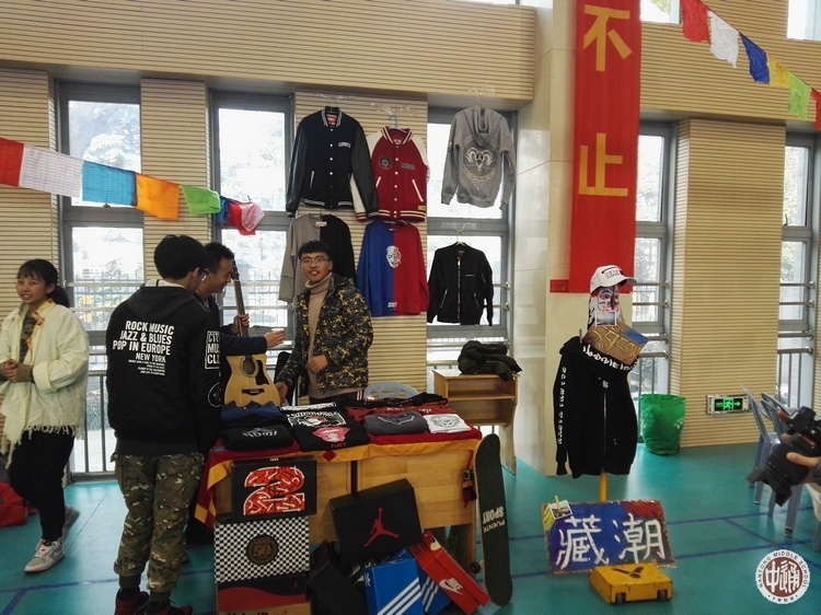 “藏装试穿区”挂满了以拉萨和那曲地区为主的各式藏装,藏族学生热情地为汉族老师和同学试穿。穿着藏族服饰的汉族同学纷纷举起相机记录下自己最富有民族特色的一刻。而一旁新设立的“藏潮区”则展示着年轻人最喜欢的具有藏族元素的卫衣、滑板、cap等,这里时尚与传统檫出别样的火花。