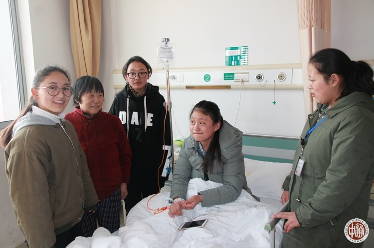 米玛吉巴同学是一位来自西藏自治区日喀则地区的农村学生,初中毕业于日喀则市江孜县第二中学,到南通中学内地西藏班读高一,是她第一次离开家乡到内地读书,因病住进医院并进行手术,内心还是有些恐惧和不安。学校及时组织米玛吉巴初中时的同学和表姐(也是南通中学内地西藏班读高二)来到医院陪伴,陪她聊天解闷。