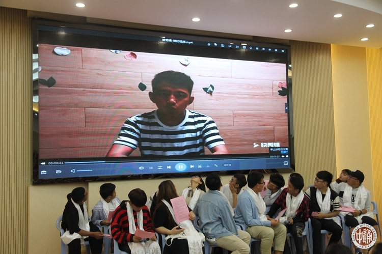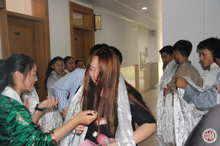 上午8点,毕业生代表步入曾经熟悉的校园,民族处的老师和数位高二的同学早已在门口迎接,彼此热情拥抱。当重返母校的毕业生们走近第一场活动“毕业生代表与在校西藏班学生互动沙龙暨为高三加油鼓劲仪式”的科学楼三楼会场时,在校的西藏生用最真挚、最热烈的的方式欢迎学长们的到来,十余位同学身着藏装在报告厅的门口排成长队,给每一位进场的学长们献上洁白的哈达,场内所有260余名同学站起高唱藏歌,鼓掌欢呼,瞬间一股回家的温暖涌入学长们的心间。活动由一段温情的视频拉开帷幕,视频由高一西藏生制作,回顾了2017届西藏班同学们昔日的校园生活及毕业时的点滴。