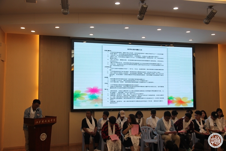 在交流环节伊始,学生党员、优秀毕业生普布扎西和格桑旺久,结合自己一年的大学经历和往昔高中的学习与生活,围绕着高中阶段应如何明确奋斗目标,应培养怎样的素质与能力,如何严格要求自我等话题,进行主旨发言。真挚的教诲,亲切的话语给予在场的在校生们兄长的精神引领。在接下来的互动中,到场的所有毕业生代表针对学弟学妹们所提出的困惑给出了关于学习、生活、人际交往、文化交流等诸多方面的意见和建议。在他们话语里,能读出学长、学姐们对弟弟妹妹们的关心与爱护,更能读出通中西藏班“新老相承”传统背后的情怀。