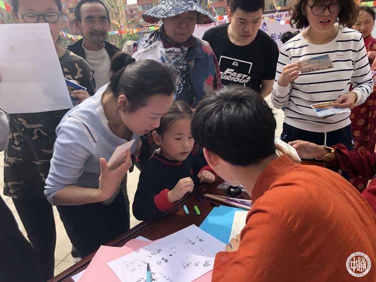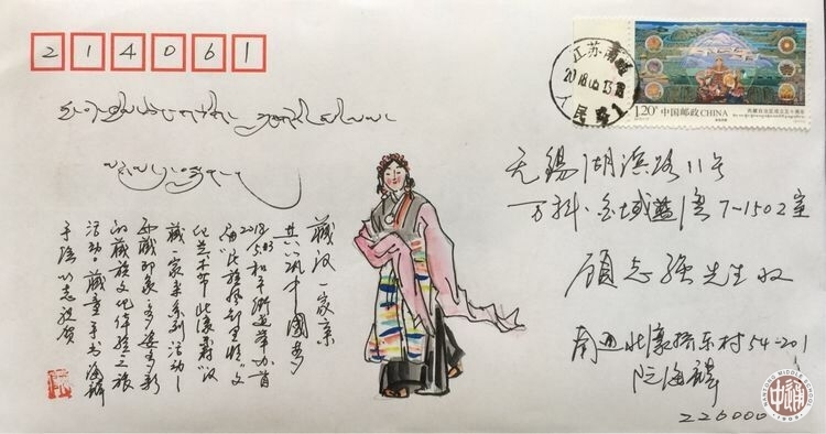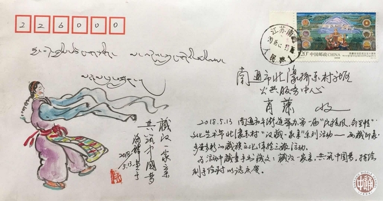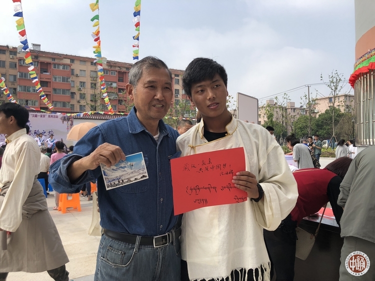 “藏文书法展示体验区”的长条桌前人头攒动,你得“挤”才能站到桌前。体验区设计了“藏文化常识问答”,答对问题的获得一张西藏风光明信片,一旁的藏族同学用优美的藏文在明信片上写下姓名和满满的祝福。人海中一位社区的老者,特意让同学用藏文写上“汉藏一家亲,共筑中国梦”,然后配上自己的绘画,贴上西藏自治区成立50周年的纪念邮票,在当天寄出,盖上了5月13日的邮戳,长幼友谊、汉藏情谊在小小卡片中传递。