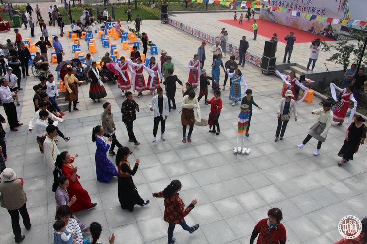 “藏族歌舞表演区”,西藏七个地区的锅庄舞表演吸引着居民们参与其中,烈日炎炎丝毫影响不了她们的热情。认真的样子、有板有眼的动作也带动了舞蹈学生的情绪,一曲接着一曲,歌舞最能融合彼此的感情。