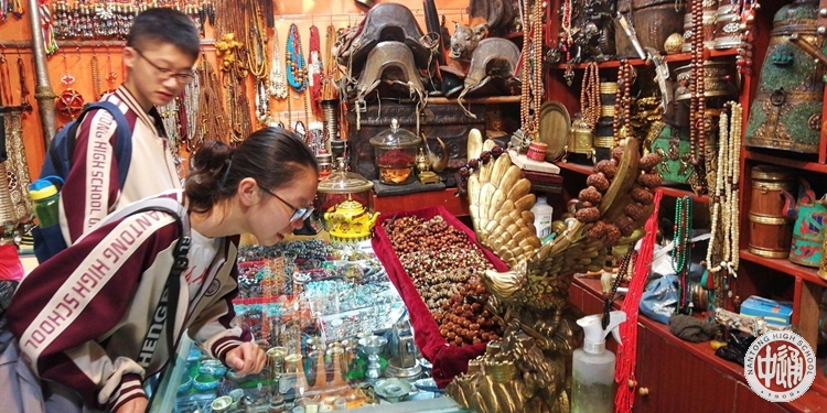 在工艺品商场内,遇见一家非常有特色的工艺品店 。店主是一位藏族老人,店里满是有历史背景的古董,别具藏文化的特色,甚至有格萨尔王时代的东西。热情的店主为我们介绍每一个东西背后的故事和由来,还教导我们珍惜现在的学习机会,这是一次非同寻常的体验。