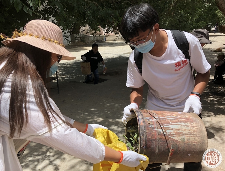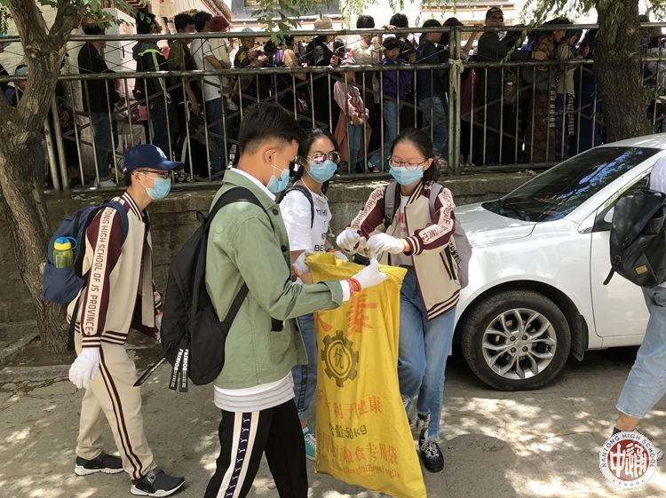 炎热的午后,我们跟随高二高三的学长,带上口罩,换上手套,来到了色拉寺。在西藏的这几天,享受了太多西藏的美丽风光,也是时候,为西藏贡献自己的力量。色拉寺风景优美,丰厚的文化底蕴,吸引了无数游客,却也让垃圾随处可见。青色的石板路,透着古朴的气息,可惜路上的纸巾塑料破坏了这一美景。高大的柏树,鲜艳的蔷薇,让这座古老的寺庙染上了生命的活力,只是随意丢弃在树下的饮料瓶刺痛了行人的双眼。