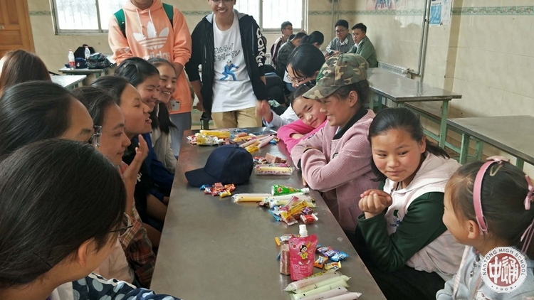 高二高三的志愿者们精心为孩子们准备了许多零食、牛奶等,并且与他们一起交谈,询问他们的日常生活。刚开始,许多孩子都红着脸低着头,双手紧张的攥在一起,只敢低声回答一两句。渐渐的,欢笑声开始洋溢在每一个桌上,他们开始抬起头,笑容满满绽开,和我们聊起了各种各样的话题:世界杯、篮球、生活、受教育情况......无话不谈。
