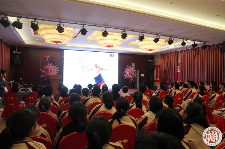 仪式后是“明德研学•状元报告”,我校2017届优秀毕业生、高中预备党员、现就读于中国人民大学的普布扎西,2018届优秀毕业生、现就读于北京师范大学的嘎玛措姆分别与高二的同学们分享了自己的故事与励志体会。普布扎西的报告以“如何打造一个更好的‘我’”为主题,从一个特殊的话题开始:“‘西藏生’的身份是我们规避学习问题的‘护身符’吗?”,结合自己在大学的所见所感所思,通过用一个个小问题串联起来的讲听互动,挖掘西藏生群体自身存在问题的同时,给出切实可行的改进方案,鼓励学弟学妹们从高中开始,在身体、学习、能力、品格等方面为未来的发展做些实事,从而打造成“自己”喜欢的“自己”。