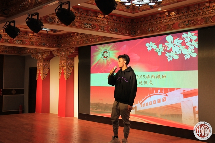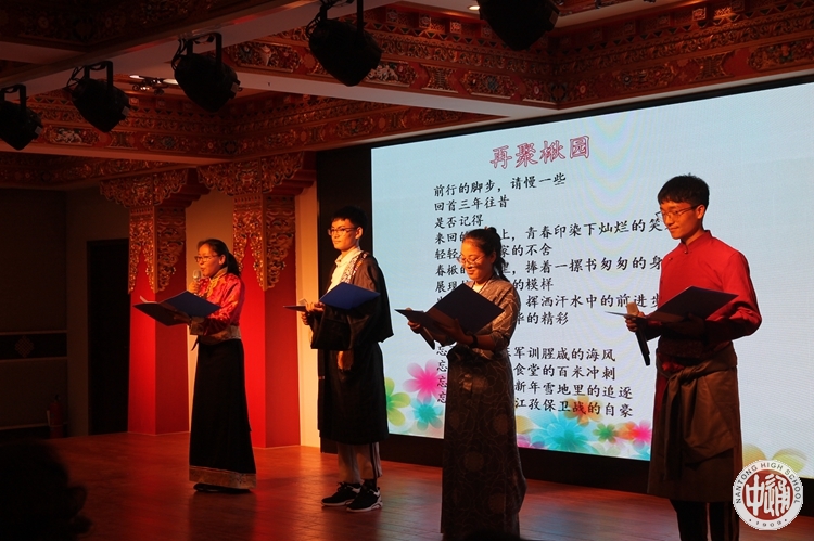 四位高一高二学生向在场的84位学长深情的朗诵了《再聚楸园——高一高二西藏生致高三学长的话》,话语中表达出对高三学长的恋恋不舍和发自内心的感激与祝福,寄托了能与学长在来年老楸树花开之时再聚校园的深切期望。在动情的告白之后,80余位高一西藏班同学手持洁白哈达,步入会场,缓步走到高三学长面前……与此同时,赠与的是160余张高一高二西藏生每一人写给学长的明信片短信。