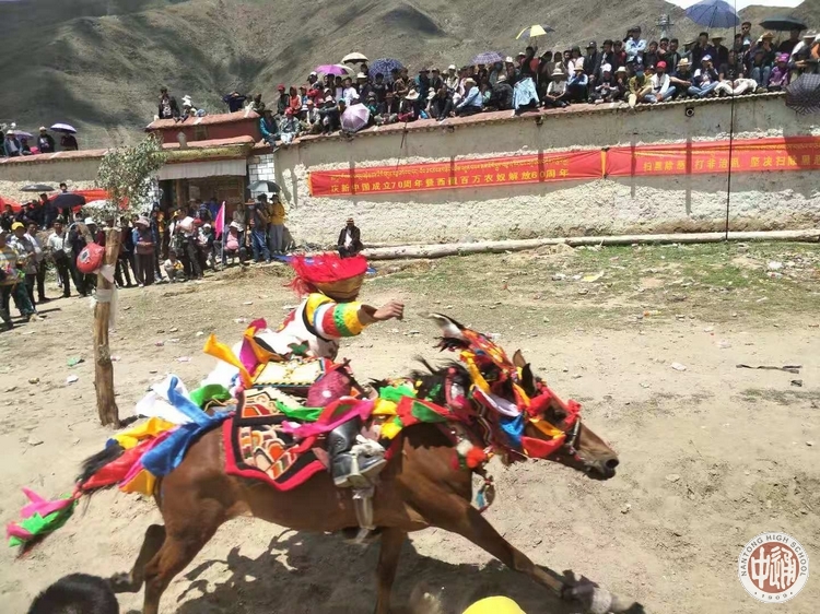 参观完邦典厂后,我们就相约前往赛马场。场地上人山人海,赛马的骑手们穿着艳丽的服装,腰上配着短刀和弓箭,骑着骏马在场地中潇洒。比赛十分精彩,观众们在一旁欢呼着。