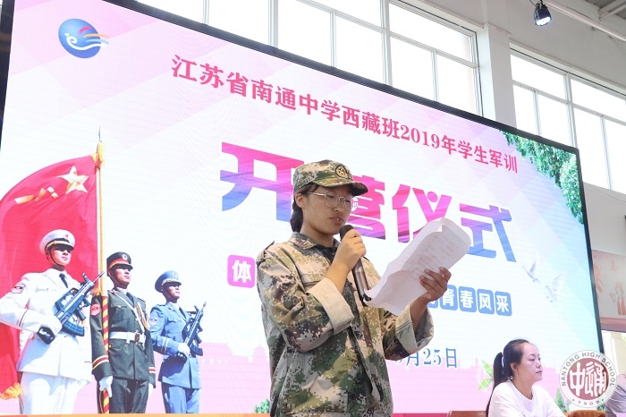 高二年级学生代表桑登旺姆在发言中承诺:在军训中,将服从命令,听从指挥。苦练基本功,磨练意志力,以优异的成绩向学校领导和教官汇报。