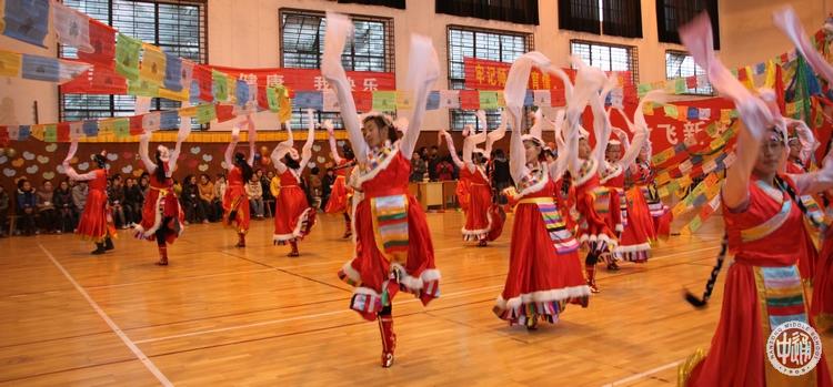 市政府民族宗教事务局领导在我校党委书记关工委主任韩明飞、校长助理关工委副主任沈惠祥、民族教育处主任於锡龄陪同下来到现场致贺并与同学们共庆新年。以下是开场舞“扎西德勒”精彩舞照。