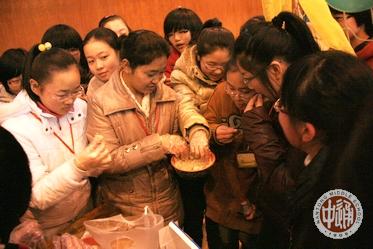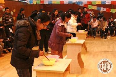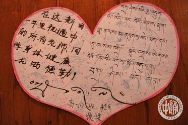 藏族同学主持人大声宣布:我们特地准备了藏历新年传统食品糌粑、酥油茶、奶果;面前的是制作糌粑的原料,有没有哪位汉族同学想和这位藏族同学学一学怎么做糌粑?有藏族同学现场表演汉字书法,还有在心形标贴上用汉藏两族文字书写祝幅词。 自西藏生融入通中大家庭以来,汉藏友谊的桥梁也架了起来。我们一起去划船、逛街,一起到社区过节。你们从雪域高原来到江海福地,我们愿用真诚的心走近你们。 |