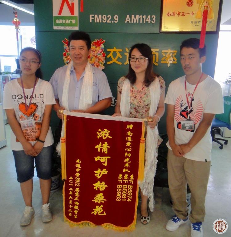 6月14日中午,西藏学生代表在民族教育处主任助理蒋卫星带领下,来到南通人民广播电台,特别感谢南通929爱心阳光车队,并赠送锦旗“浓情呵护格桑花”。爱心车队的两位队长接受了锦旗。