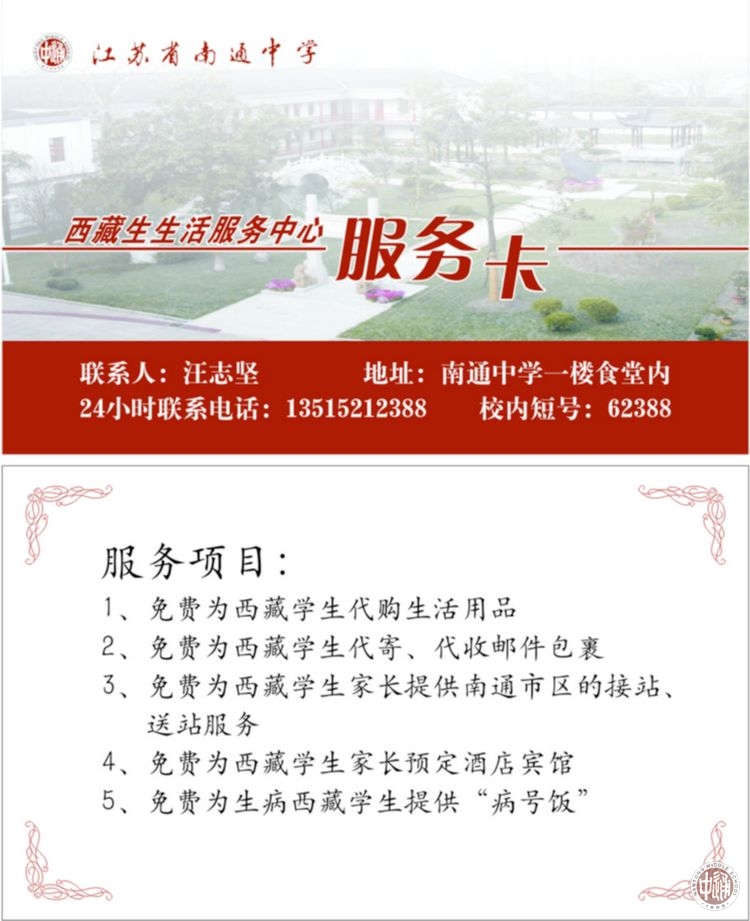 服务中心座落在一楼食堂北侧,服务中心向每位在校西藏生发放服务卡,提供24小时不间断服务。服务内容包括:免费代购生活用品、免费代寄代收邮件包裹、免费向西藏学生家长提供市区接站和送站服务、免费预定酒店、免费提供“病号饭”等多项服务内容。