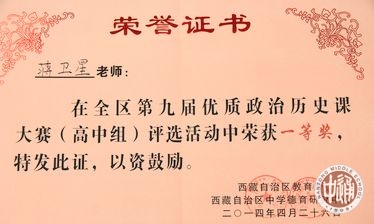 由西藏自治区教育厅组织、西藏自治区中学德育研究中心主办的“全区第九届高中政治历史优质课大赛”4月20日至27日在西藏林芝第二高级中学举行。我校蒋卫星老师作为内地西藏班代表参赛展示,并荣获一等奖。 |