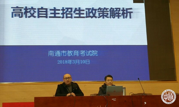 3月10日下午,学生处邀请了南通市教育考试院吉海波院长来校进行了“2018年高校自主招生政策解析”的专题讲座,学生处潘雪峰副主任主持会议,陈建云副校长、滕旻彦主任参加了本次活动。