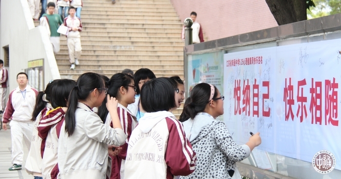签名活动得到老师和同学们的积极关注和踊跃参与,图为一群同学伙伴在横幅上签下自己与“快乐”的约定。