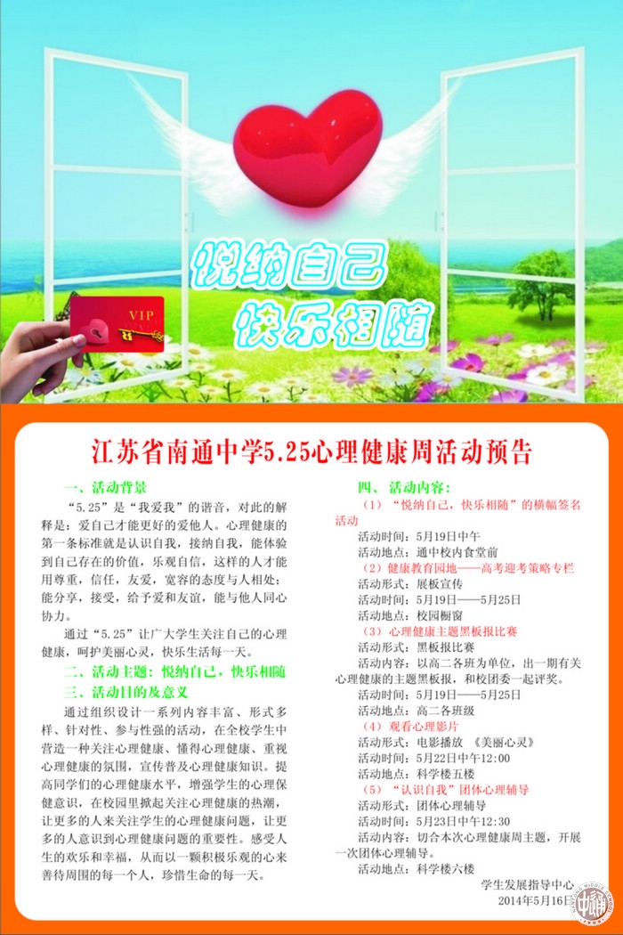 本次活动周主题:悦纳自己,快乐相随。活动通过组织设计一系列内容丰富、形式多样、针对性、参与性强的活动,在全校学生中营造一种关注心理健康、懂得心理健康、重视心理健康的氛围,宣传普及心理健康知识。提高同学们的心理健康水平,增强学生的心理保健意识,在校园里掀起关注心理健康的热潮,让更多的人来关注学生的心理健康问题,让更多的人意识到心理健康问题的重要性,感受人生的欢乐和幸福,从而以一颗积极乐观的心来善待自己、善待周围的每一个人,珍惜生命的每一天。