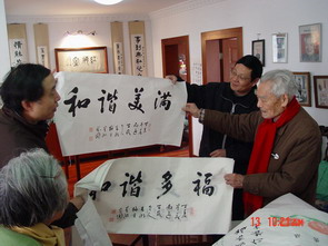 图2:我校学生代表向朱老献上书画作品,朱老也向学校回赠百岁时的书作。
