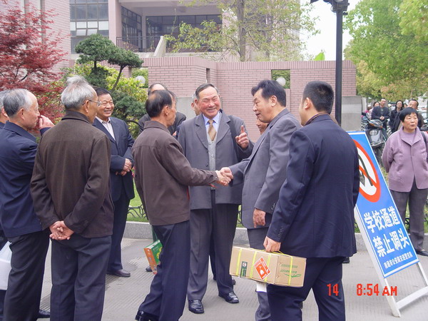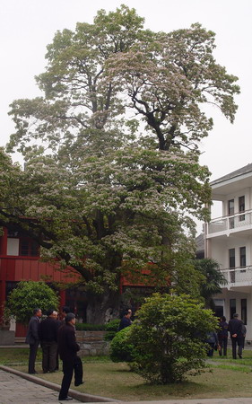老楸树开花了。 校园里的老楸树已经370多岁,依然枝叶繁茂。早在我校建校前很久很久它就矗立在那里。它看着我校一代一代的前人从它身边走过。一年又一年,无数校友回校时都会像看望老祖母一样看望老楸树。 4月14日,我校五九届高三(3)班的毕业生回来了,跨过半个世纪的风风雨雨,来看望母校,看望老楸树。老楸树在风中抖擞,频频弯腰,枝叶索索,落英如泪。 与这些年近七十的“孩子们”相聚的还有当年的班主任——七十九岁的我校退休女教师陆明彦。