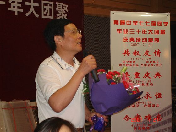 下午2:30分,毕业三十周年聚会在宴会厅举行。主持人张伟同学和万培培同学宣布庆典开始后,即一一请出当年的班主任、课任老师陈新华、侯荣慧、曹子能、李楠、杨建勋、保韻琴、范德先、邹玉兰等通中前辈,并向他们敬献了鲜花。随后主持人邀请刘校长讲话。刘忠保副校长首先代表通中党委、校长室和缪建新校长以及全校师生向七七届校友表示热烈的祝贺。刘副校长还向校友们介绍了通中近几年发展的辉煌业绩,并诚挚地邀请校友百年校庆之际回母校共叙友情。接着1—6班同学代表先后登台发言。他们以挚热的感情,优美的文辞向母校老师、领导表达了深深的感恩之情,浓浓的同学友情更是溢于言表。