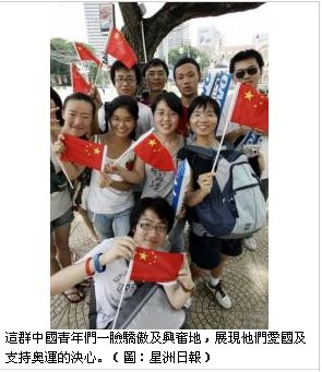 下面这张图来历非凡,刊发在马来西亚最大的华文报刊《星洲日报》,记录了中国留学生欢呼奥运火炬接力的动人场景。后排右起第二个是我校原卞晓燕老师班的周津生同学,现正在新加坡管理大学读书。原报刊照片下面的文字说明真动人!