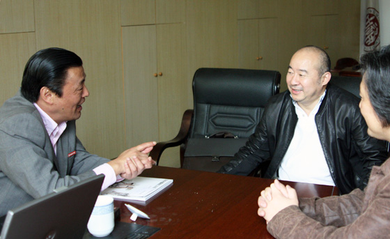 范扬擅长中国画,工写兼备,作风淳厚,意味纯正,作品《支前》、《苦麓烟峦》等为中国美术馆,江苏省美术馆等展馆收藏。这次回母校受到校长缪建新的热情接待,在缪校长办公室畅谈美术教育在母校百年文化中的重要地位(下图),并向向母校赠送了“2008激扬江山范扬绘画作品展”最新作品集(题头图)。