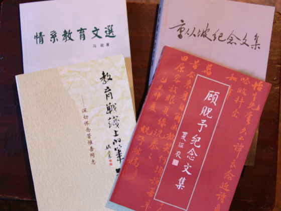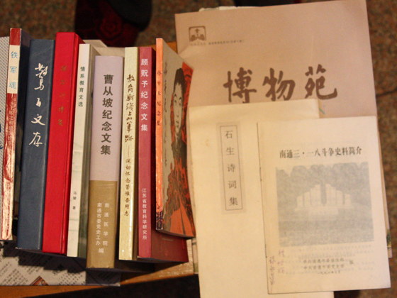 上下图中的书籍都是严老多年收集的南通中学党史资料。书名所涉曹从坡是抗战胜利前后南通地下党城工部文教战线领导人之一,建国后任南通市副市长;管维吾和马骏前面介绍过;顾貺予是与管、马等一起从解放区来的党外民主人士,新中国成立后任我校校长。