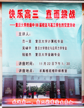 三位校友分别介绍了复旦大学的教育教学概况、完成高三学业面对高考的学习策略和如何应对复旦自主招生考试的准备工作。