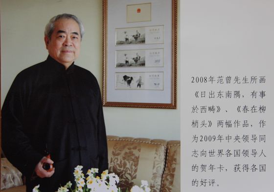今年初,范曾先生所画《日出东南隅,有事於西畴》和《春在柳梢头》两幅作品作为2009年中央领导同志向世界各国领导人的贺年卡,获得各国好评。这次回乡,范曾先生向我校领导欣然承诺为百年校庆向母校捐赠贺年卡原件一套(下图)。
