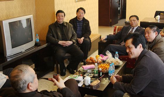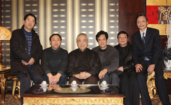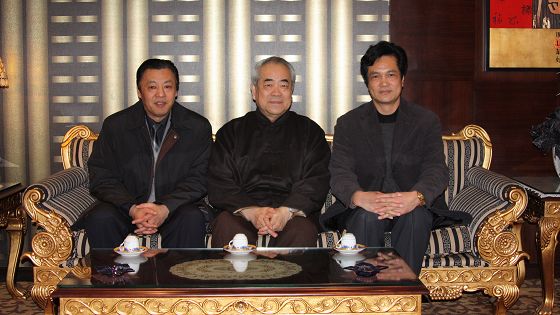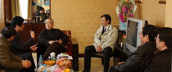 我校领导与范曾先生畅谈近日中央电视台《我们》栏目连续播放的范曾节目观感,对范曾先生多年来给予母校的帮助表示衷心感谢。上图是我校前任校长缪建新(现市教育局局长)和现任校长姚天勇与范曾先生合影,下图是我校现任领导班子全体正副校长与范曾先生合影。