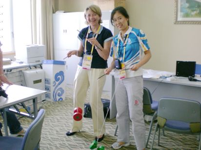 戴文君 江苏省南通中学2005届校友,现就读于北京外国语大学国际商学院金融系,奥运会期间作为IOC(国际奥委会)行政助理,为国际奥委会团结基金提供行政助理服务。下图为戴文君同学(右一)赠与团结基金办公室空竹,并教主任抖空竹。