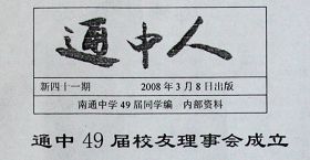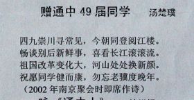 在1949届通中校友自办的《通中人》报(下左为报头图)第四十一期上刊登了汤老于2002年聚会时写的七言诗《赠通中49届同学》(下右图)。