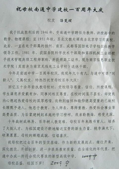 汤老师一生从事教育事业,曾被选为扬州市第三届人民代表大会代表,是我国高校老一辈雷达专家之一。因年事已高,汤老师耳朵不大听得清了,只能口授对通中的贺函,由他的学生整理打印出来。以下是贺函全文。虽然只在通中教过书,没有在通中上过学,但汤老师仍坚持在贺函标题中称南通中学为母校。 |
