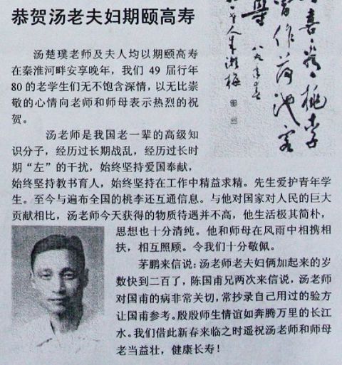 同期《通中人》报还刊发了汤老的弟子们(都是年近80的通中校友)给汤老的贺寿辞《恭贺汤老夫妇期颐高寿》(下图)。