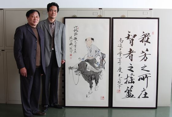 下图是我校校长姚天勇(右)和退休的老校长汪乾荣(左)在范曾书画作品旁的合影。书法作品是范曾致母校百年华诞的题词“众芳之所在,智者之摇篮”,画作是名为“山林野趣”寓意孺子牛的童子骑牛图。