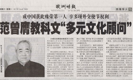 范曾受聘联合国教科文组织“多元文化顾问”不仅是母校荣耀,也是国家和民族的荣耀。《欧洲时报》在报道此事时称范曾为“中国获此殊荣第一人”。 左图和下图是联合国教科文组织颁发给范曾的红色护照,该护照在世界各国享多项外交使节权利。 |