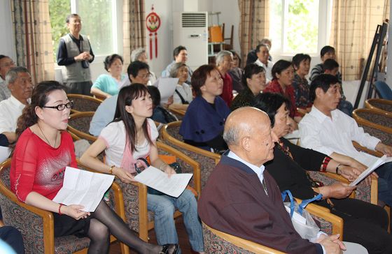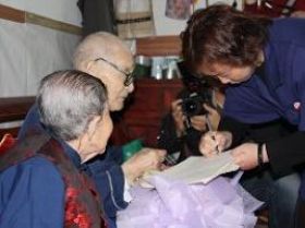 汤老身体健朗,但听觉不大方便。下左图我校许薇老师正与汤老笔谈,并将汤老在南通中学时教过的学生、原天津市副市长陆焕生等人的贺礼转交给汤老。