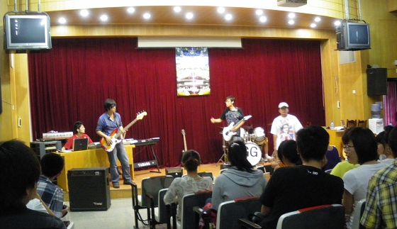 我校2007届毕业生徐天琪、朱天睿、黄蒙、杭铄金等组织的GG(金色一代)乐队8月1日在我校敬铭楼3楼报告厅成功举办专场演唱会,欢庆母校百年诞辰。几百名同学济济一堂,歌声、鼓声、琴声、掌声响成一片,高潮迭起。