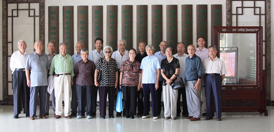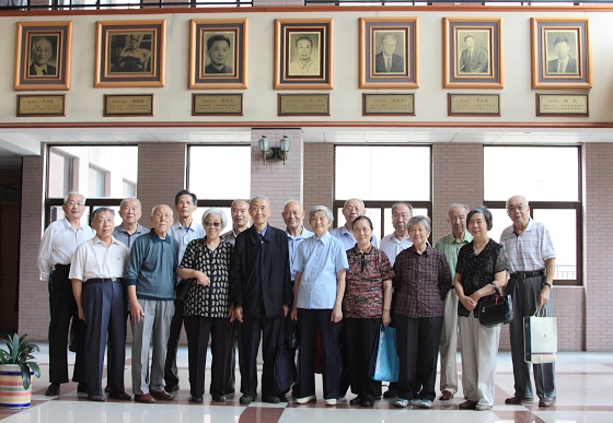 上下两图特别有意思。上图校友们在“诚恒”校训雕塑前合影,给他们拍照的是随行的儿女,镜头前的老人们却流露出少年时的顽皮欢快神情;下图是在敬铭楼大厅的合影,前排居中着深色服装的老者正是背景中悬挂的校友院士像居中的中科院院士姚穆。 |