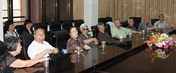左图背景是悬挂在我校艺术长廊中的著名校友范扬的画作,照片中韩明飞书记身边的女士是范扬的母亲,她刚从海外赶回来参加校友聚会的。 以下两图中的校友们正在敬铭楼会议厅畅谈中学时代的有趣生活。看他们笑得多开心,正商量下次聚会活动呢。老人们当年毕业后第二年就赶上新中国成立,可以说整个人生都跟新中国息息相关。大家相约:这辈子还要多聚聚,聚一次就多一次欢笑。 |