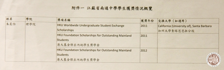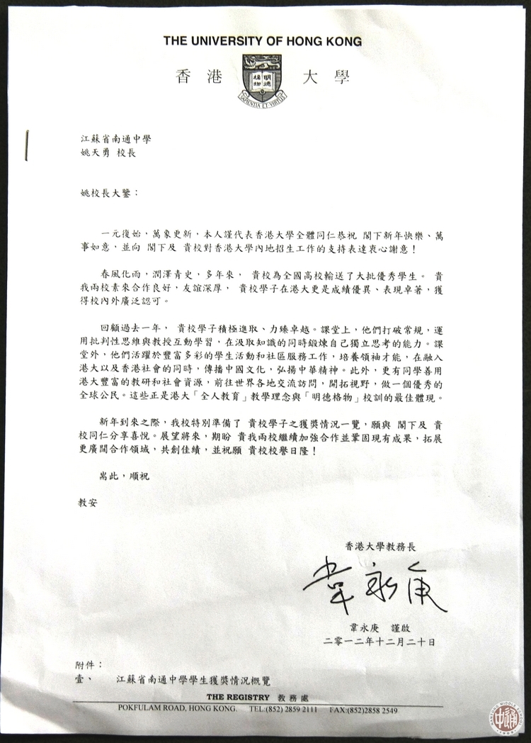 香港大学2012年12月20日向我校校长姚天勇发来报喜函,与我校师生分享在港大理学院就读的我校2009届校友朱晨怡连续两年获奖的喜悦。