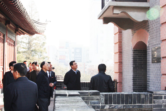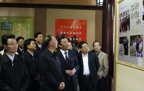 各级领导们在中共中央前总书记江泽民为我校的题词“百年通中,英才辈出”展板前肃然起敬(下图)。