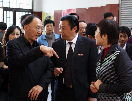 11月13日上午,在江苏省副省长何权(下图前排左二)陪同下,国家体育总局局长刘鹏(中)前来我校视察。陪同视察的还有南通市委书记罗一民(右一)、副书记黄利金和副市长杨展里。
