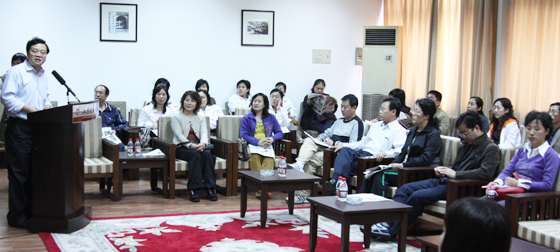 山东潍坊新华中学校长班主任来访 来源: 发布时间:2011-05-16 09:54:30 浏览次数: 次 【字体:小 大】 10月23日下午,山东潍坊新华中学领导带领班主任一行五十余人来访我校。我校学生处主任沈惠祥(下图左)向来访客人详细介绍了我校“难忘教育”活动和班主任工作特点,并与客人就改进班级管理问题作了交流。 分享到: 【打印正文】