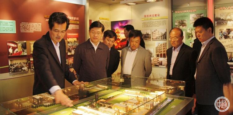 上图姚天勇在科学楼大厅正向来宾介绍通中校友中的20位院士,下图在校史陈列馆解说校园沙盘。