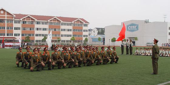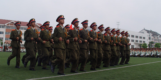 阅兵式开始了,“南通市高级中学军训团”的大旗率领八校千人大军经过司令台,接受市政府领导和南通军分区首长的检阅。八校的校长也在司令台上观看。