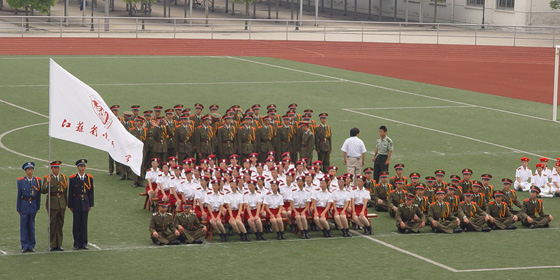 坐在场外观看兄弟学校表演,依旧军纪严明。
