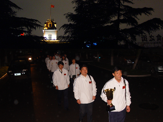意大利时间28日下午2:10,队员们带着胜利的喜悦登上国际航班飞返祖国,经过19个小时的飞行,于北京时间29日下午5:30抵达上海虹桥机场,当晚10:00风尘仆仆回到学校(上图)。