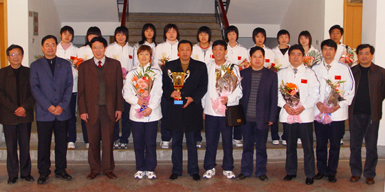 寒来暑往,汗洒球场,终于迎来决战,夺得胜利的奖杯。她们是通中的骄傲!让我们记住她们的姓名(上图从左至右):朱敏、陈婷婷、包金艳、李娟、刘瑾、沈戴娟、朱玲娣、袁炜玉、袁婷婷和完颜培;她们的教练是夏勤(女,下图前排左四)。